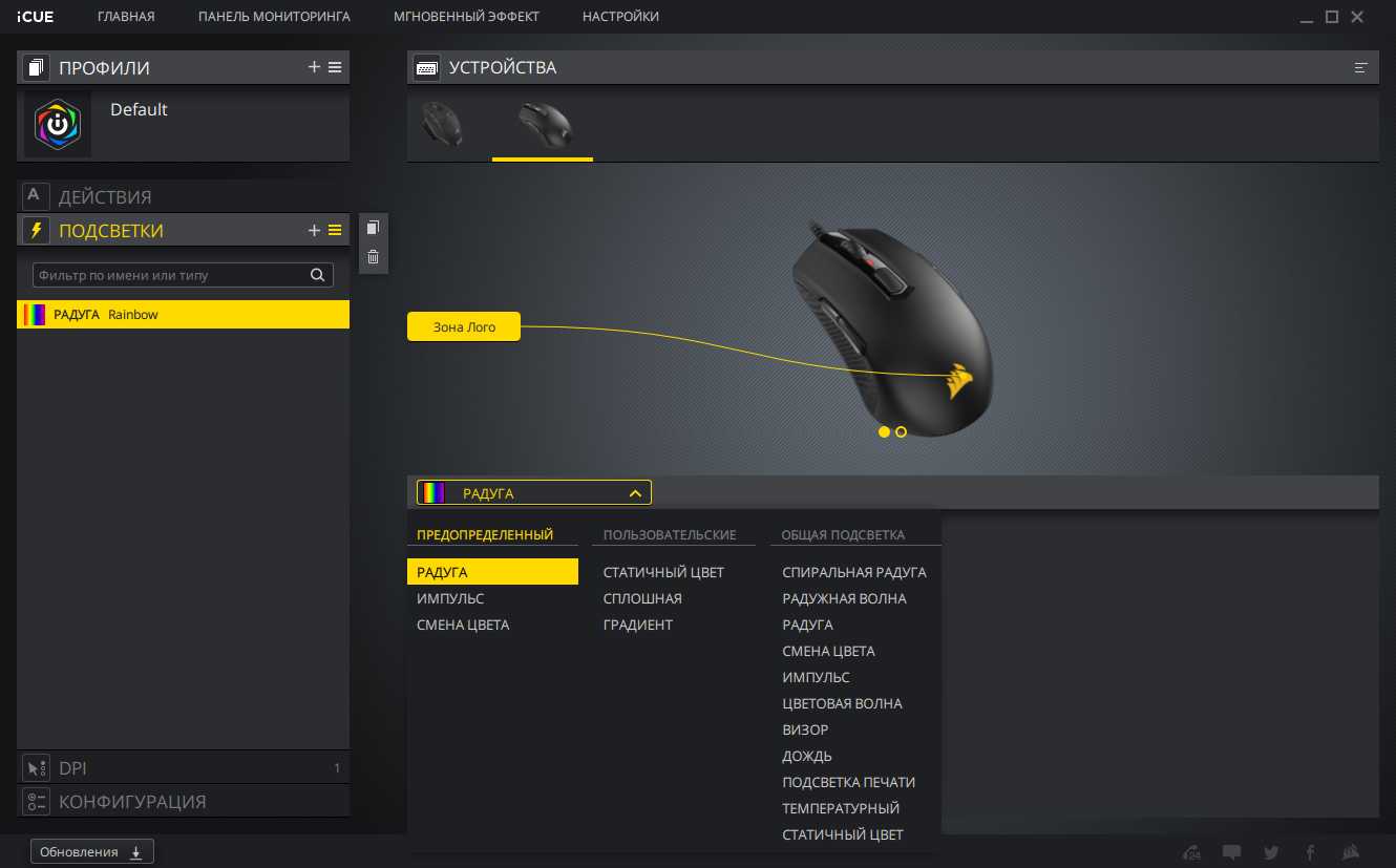 - Lighting Effect — световые эффекты; для самой мыши они имеют смысл в среднем (как я уже говорил, подсветка закрыта рукой), но если у вас есть и другое оборудование Corsair, их можно легко синхронизировать для всех устройств