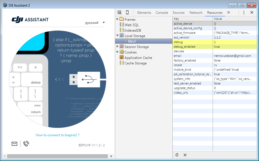 - Не подключая дрон, запустить DJI Assistant 2. Теперь приложение открывается с боковой панелью, как инструменты разработчика в веб-браузере. Там нужно перейти на вкладку Resources (она может быть скрыта за кнопкой >>).
