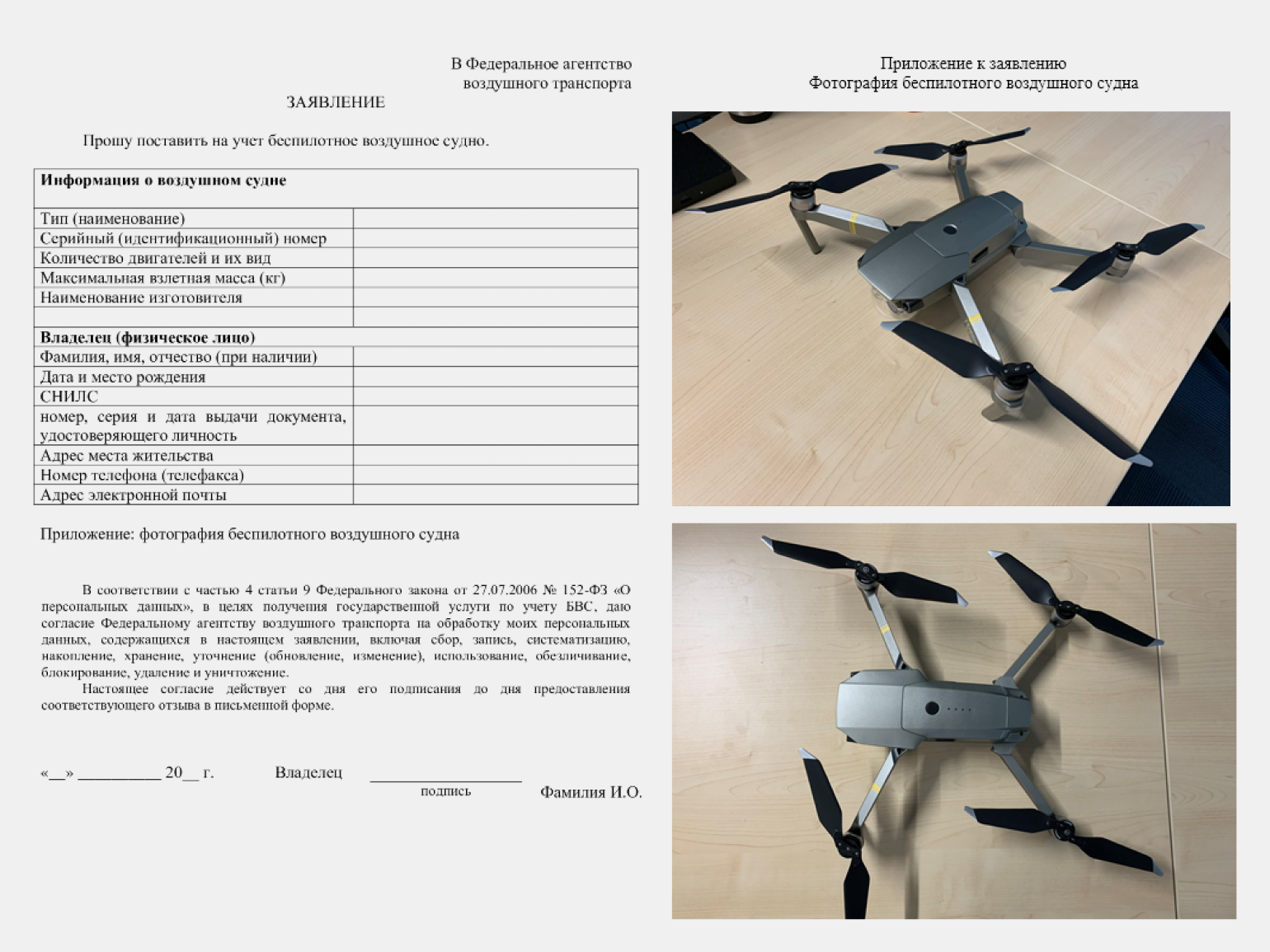 К заявлению нужно приложить фотографию беспилотника, выполненную на светлом однотонном фоне с изображением всех элементов дрона.