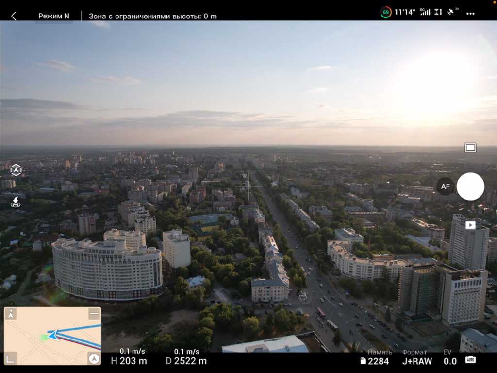 Режим CE. Взлет за городом, общее удаление ~2500 метров, из них пролет по городу примерно 500 метров. Сигнал рвется, дальше лететь невозможно.
