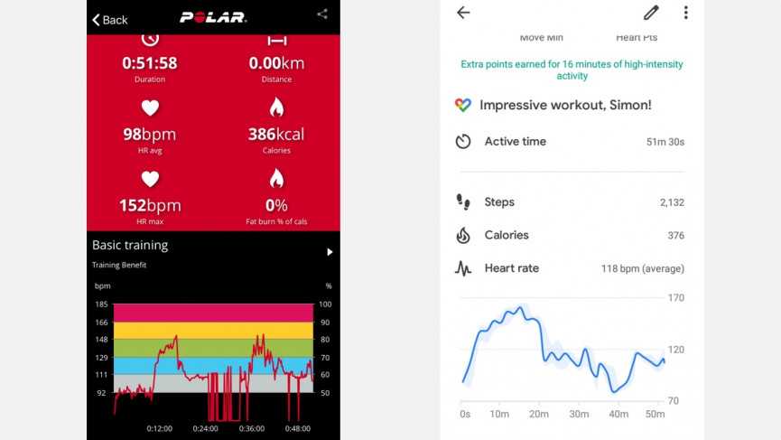 HR accuracy compared: Polar H10 chest strap (left) and Fossil Gen (right)