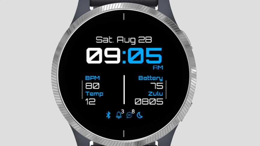 It sticks the time up top and then splits up the rest of the screen to show off information like heart rate, battery, and current temperature with smaller icons below to let you know if you’re being buzzed with notifications and messages.