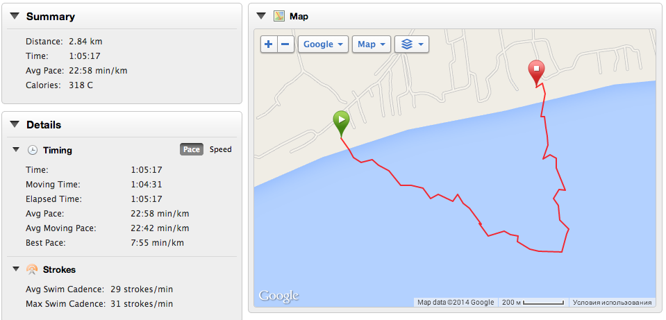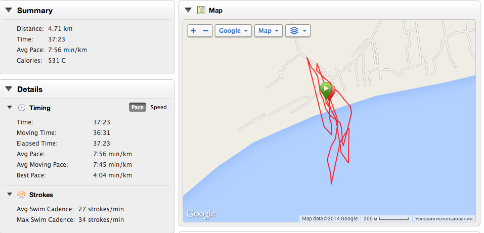 , а акселерометр измеряет количество взмахов руками. При этом каждый раз, когда часы уходят под воду, происходит потеря сигнала и подключение устанавливается вновь. В итоге разброс данных, сохраненных устройством, может быть достаточно велик. Но, несмотря на такой недостаток, Fenix2 работает в морских условиях весьма продуктивно. По результатам заплыва можно будет получить достаточно детализованную карту, уровень погрешности находится в пределах десяти процентов, где будет отображен не только маршрут, но и базовые показатели по дистанции и количеству взмахов руками.
