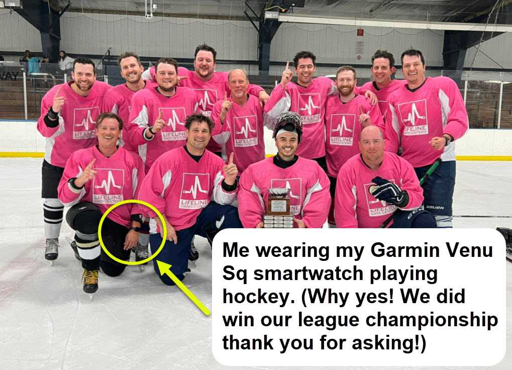 The batter life on the Garmin Venu Sq is amazing. I’ve gone nearly six days before having to charge it up, even using the GPS for tracked workouts like hiking and cardio (yes I wear it playing rec ice hockey!).