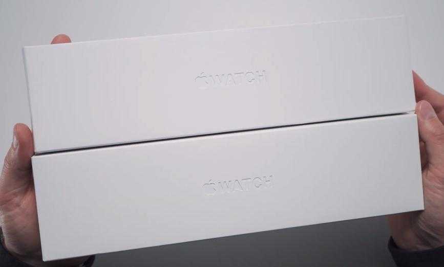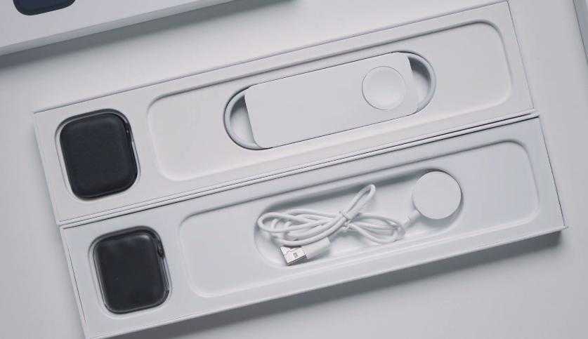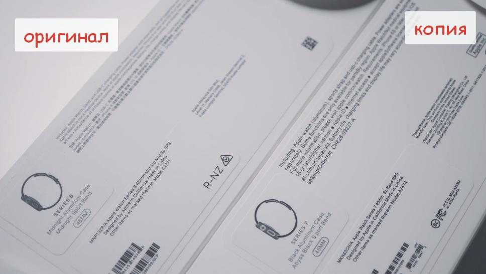 Судя по этикеткам, это Apple Watch Series 7, 45 мм алюминиевый корпус черного цвета со спортивным ремешком. Артикул, серийные номера, дизайн “by Apple in California” – все дела. Другие шрифты и отсутствие пробелов между словами заставит настоящего яблочного Гуру сомневаться в подлинности этих символов.