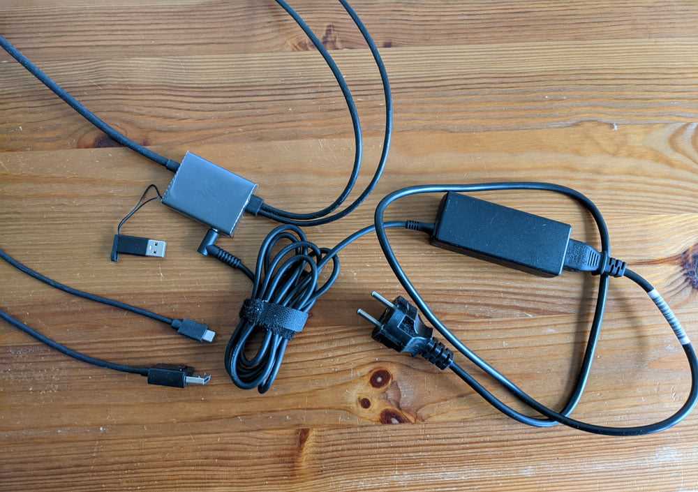 HP’s Reverb is connected via Displayport and USB-C (or USB-A adapter). Power is supplied via a small breaker box with a power adapter. | Image: MIXED
