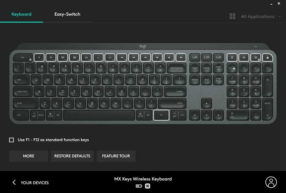 Сама конструкция устанавливается на 6 резиновых ножках, предотвращающих скольжение даже на стеклянной поверхности. К тому же, она весит больше 800 граммов, поэтому не скользит по столу. Регулировка угла наклона отсутствует, но положение клавиш продумано до мелочей, из-за чего малейший дискомфорт не возникает. Как и полагается флагманской клавиатуре, Logitech MX Keys имеет фирменное ПО Logitech Options, расширяющее возможности для настроек. В главном окне находится иконка клавиатуры с настройкой функционала и набором программируемых кнопок. Отдельные действия меняются по своему усмотрению. Также вы можете привязать отдельные команды для конкретных приложений, чтобы не выполнять переключение между профилями вручную. Приятно радует поддержка сопряжения с тремя устройствами одновременно. Список активных подключений отображается на вкладке «Easy-Switch».