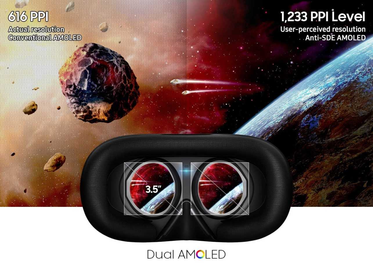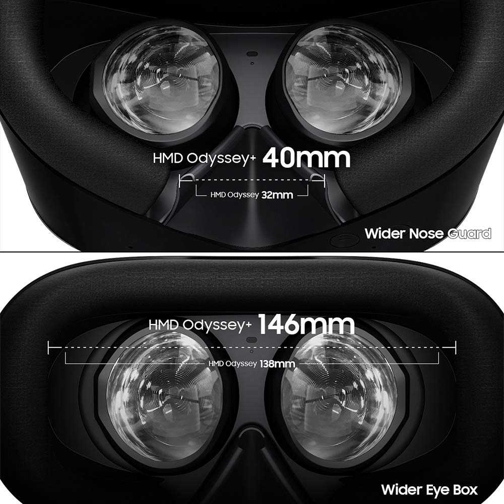 В Samsung HMD Odyssey+ установлены два OLED-дисплея диагональю 3,5 дюйма и разрешением 2880х1600 пикселей (1440х1600 на один глаз). В совокупности они дают картинку качеством 3К с углом обзора 110 градусов. Но изюминкой новинки стал Anti-SDE фильтр, который избавляет изображение от эффекта “москитной сетки”и визуально увеличивает плотность пикселей экрана (PPI) с 616 до 1233.