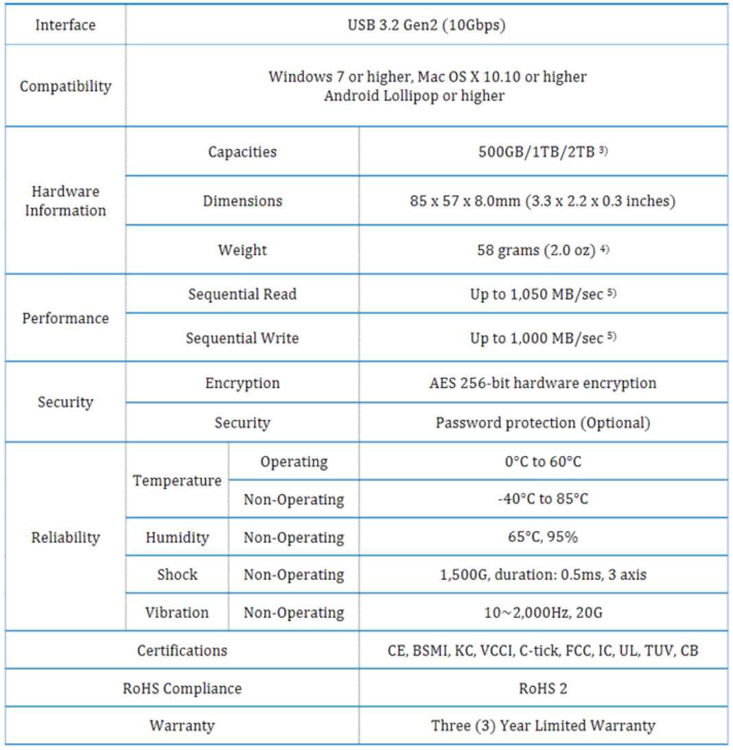 | Interface | USB 3.1 Gen 2 (10Gbps) | USB 3.2 Gen 2 (10Gbps) |