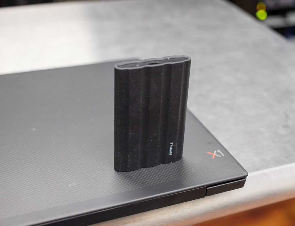 Samsung T7 Shield 4TB Standing on a Lenovo ThinkPad