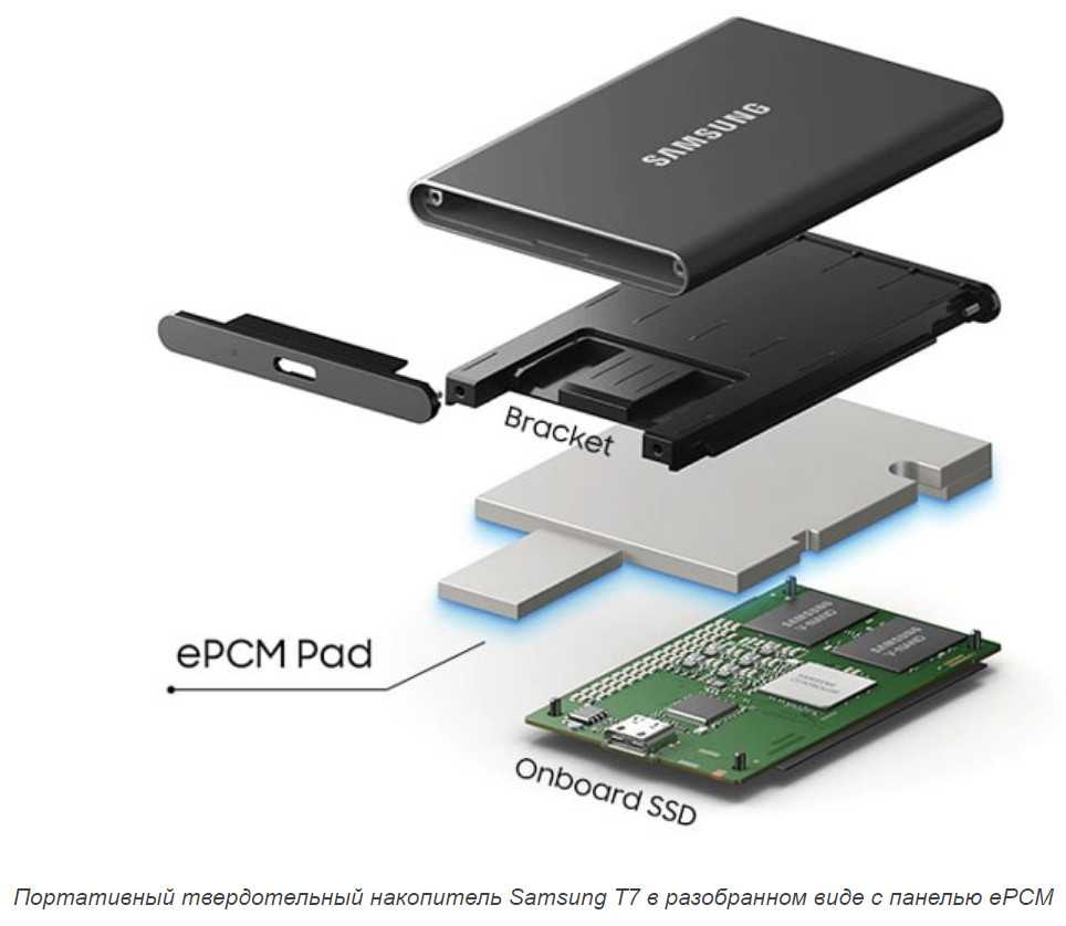 С внутренней стороны печатная плата накопителя соприкасается с тем, что Samsung называет подушкой ePCM (инкапсулированный материал с фазовым переходом) для температурного контроля. Samsung сообщает, что эта подушка помогает поддерживать температуру ниже 45 ° C при любых условиях. Как и T7 Touch, этот накопитель не сертифицирован по стандарту FIPS 140-2.