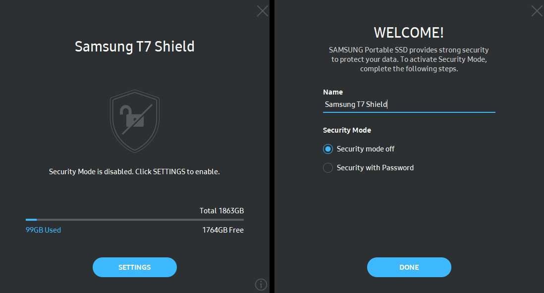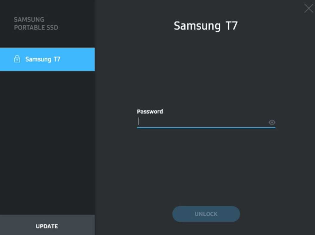 В портативном твердотельном накопителе Samsung T7 отсутствует сканер отпечатков пальцев, но он по-прежнему предлагает 256-битное шифрование AES для ваших файлов. Единственное отличие состоит в том, что устройство необходимо разблокировать с помощью кода доступа в прилагаемом приложении, если включено шифрование. Когда диск заблокирован, то для разблокировки он предлагает пользователю использовать, специальное приложение, необходимые для его разблокировки в Windows, macOS и Android. Эти диски несовместимы с устройствами iOS.