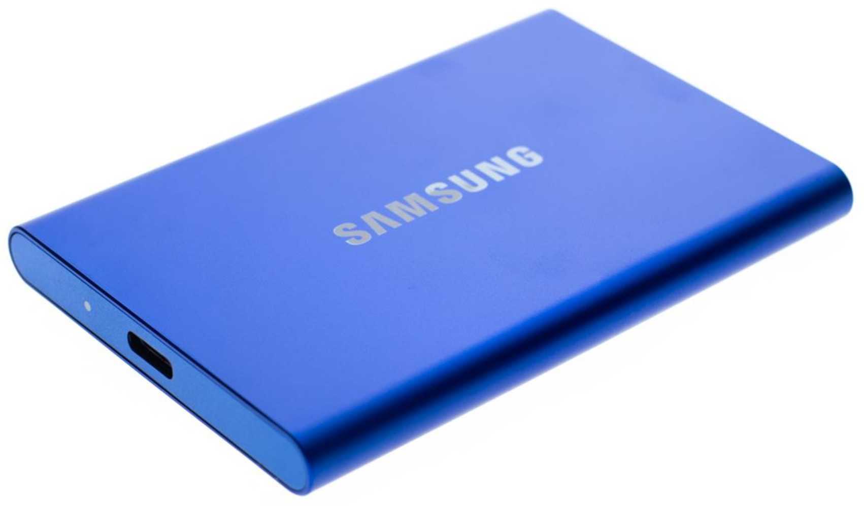 Портативный SSD T7 доступен в трех цветах: Indigo Blue, Titan Gray, и красный металлик. Наш обзорный образец — это вариант Indigo Blue, который выглядит довольно привлекательно. Он использует ту же прочную алюминиевую конструкцию unibody, легкую, но прочную.