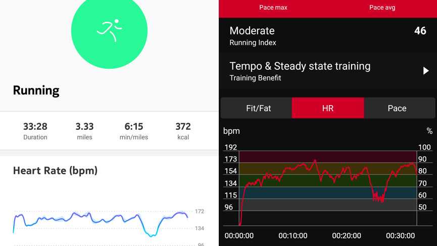 In reality, it’s very good. The image below shows a side-by-side comparison of the HR on the left and the Wahoo Tickr heart rate strap on the right during one run I went on. Not only are the peaks and troughs very much the same, the average and max HR are incredibly close.