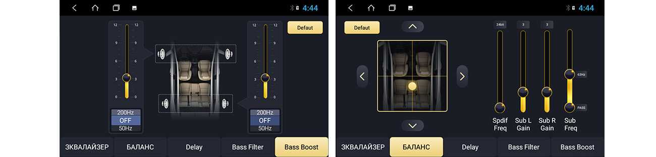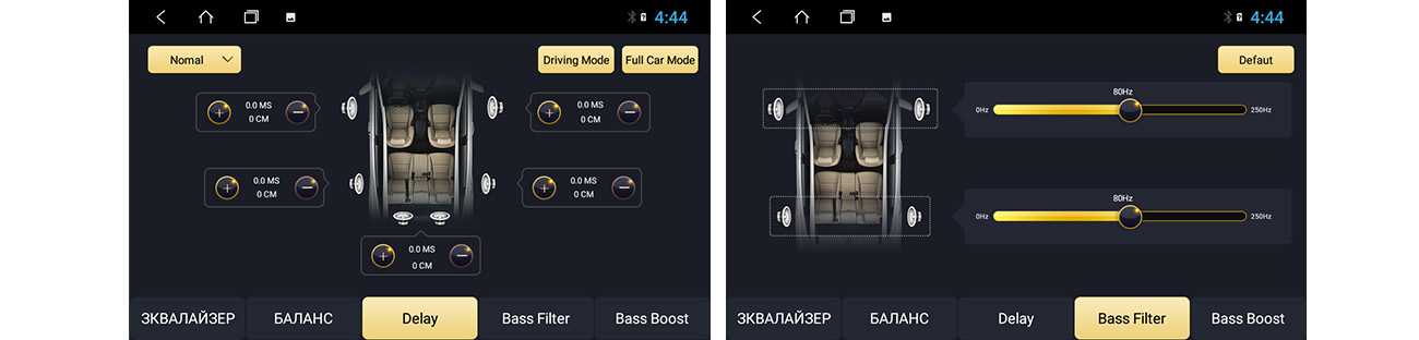 Тонкая настройка баса. По сути, басовый параметрический эквалайзер. Выберите центральную частоту и коэффициент её усиления. Добавьте баса там, где это необходимо. Функция «Гармоника» автоматически восстанавливает гармоники низких частот, потерянные при сжатии аудиофайлов. Вы поймете это, сравнив звучание DTA магнитолы с обычным автомобильным ресивером, на заводских («нулевых») аудио настройках.