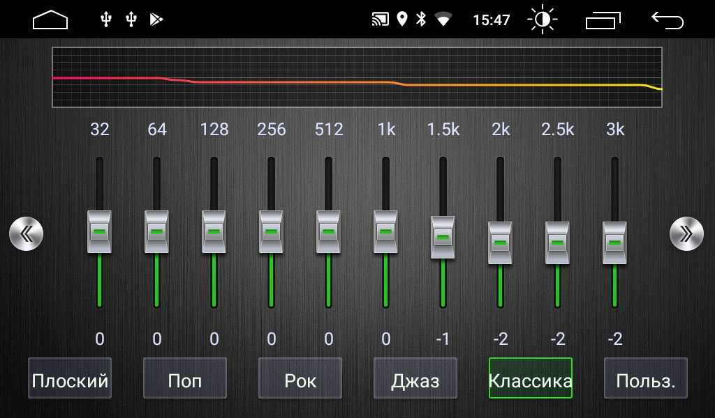 Чем шире диапазон настроек эквалайзера, тем точнее настройки частотной характеристики системы. Прежде, пользователи довольствовались всего двумя настройками темброблока: Bass и Treble (Бас и Высокие). Встроенный в DSP эквалайзер, позволяет управлять звучанием системы в зависимости от ваших потребностей и предпочтений. Настройка осуществляется уменьшением или увеличением громкости каждой из тридцати частотных полос (эквалайзер располагается на трех экранах устройства). Если Вы не хотите вникать в детали, то можете воспользоваться одним из имеющихся режимов предустановок: Рок, Поп, Джаз, Классика, Плоский или Пользователь. В режиме «Пользователь» можно сохранить индивидуальную схему настроек эквалайзера.