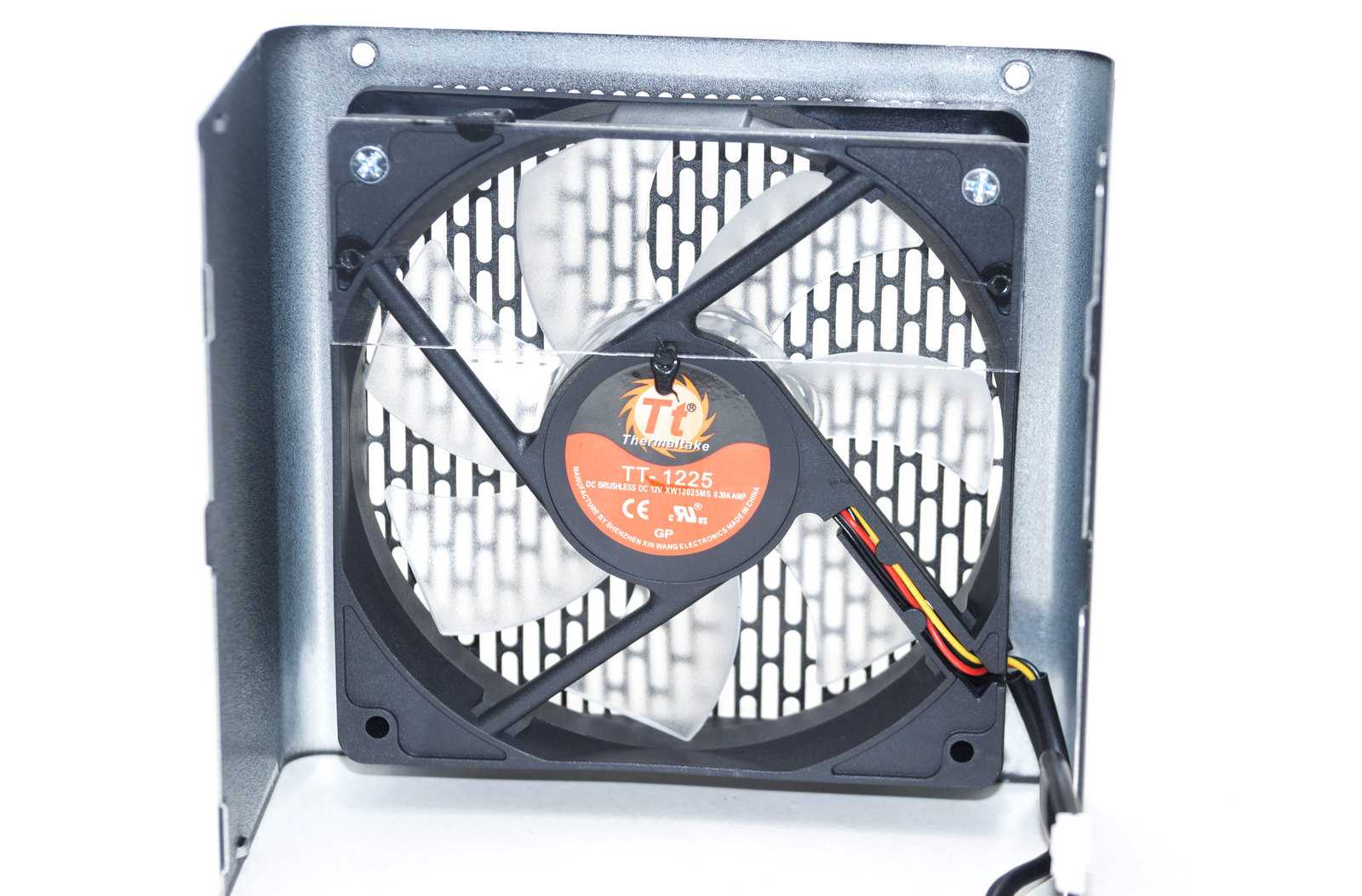 За охлаждение комплектующих и украшение подсветкой отвечает вентилятор ТТ-1225. Модель указана Shenzhen Xin Wang Electronics XW12025MS, в ней используется гидравлический подшипник.