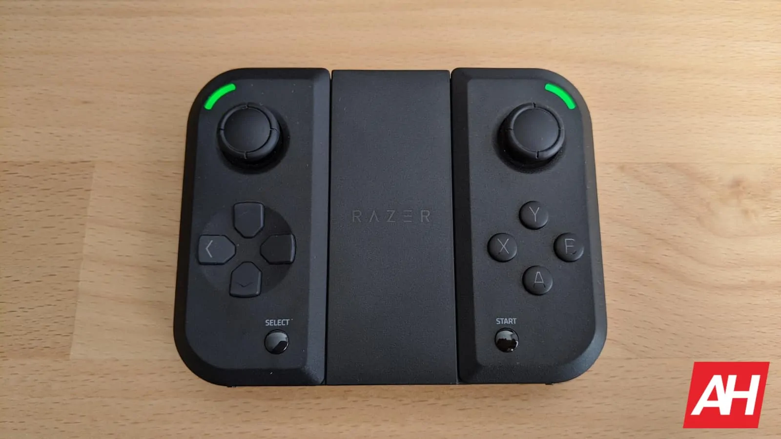 As mentioned, the right controller is basically the same. The two notable differences are the tactile switch A/B/X/Y buttons instead of the directional pad and the start button instead of the select button. Both controllers have a slot on the inside edge which is used to attach the controllers to the included phone grip cases or the slide-in controller grip. On the outer edge, near the bottom, the Razer logo is debossed in gloss black.