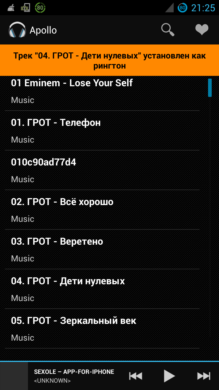 Вы также можете установить из Google Play любой музыкальный плеер и поставить песню на звонок при помощи него. В качестве примера использовался PlayerPro.