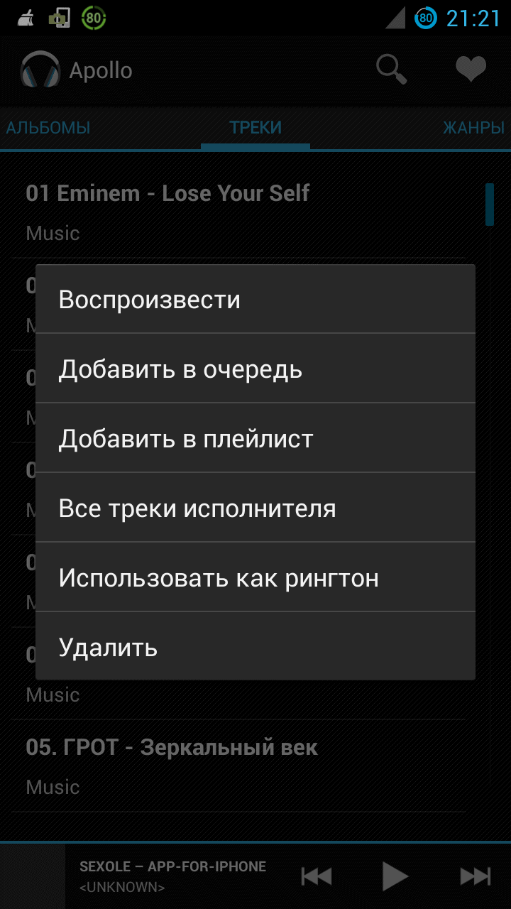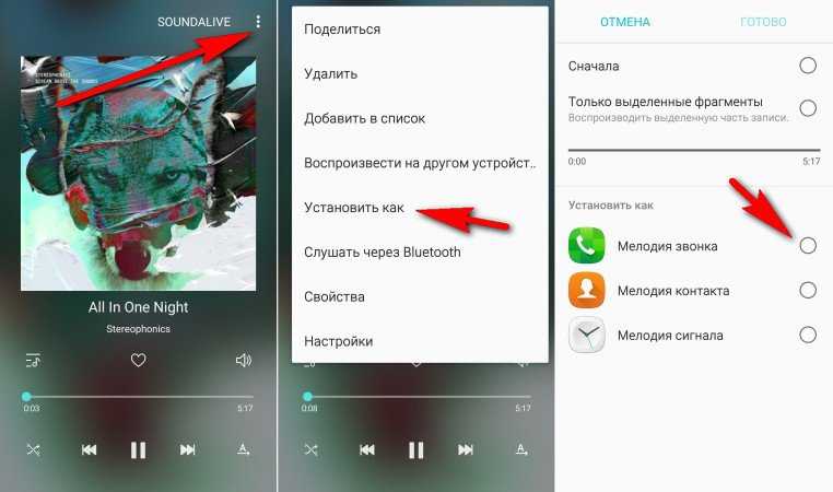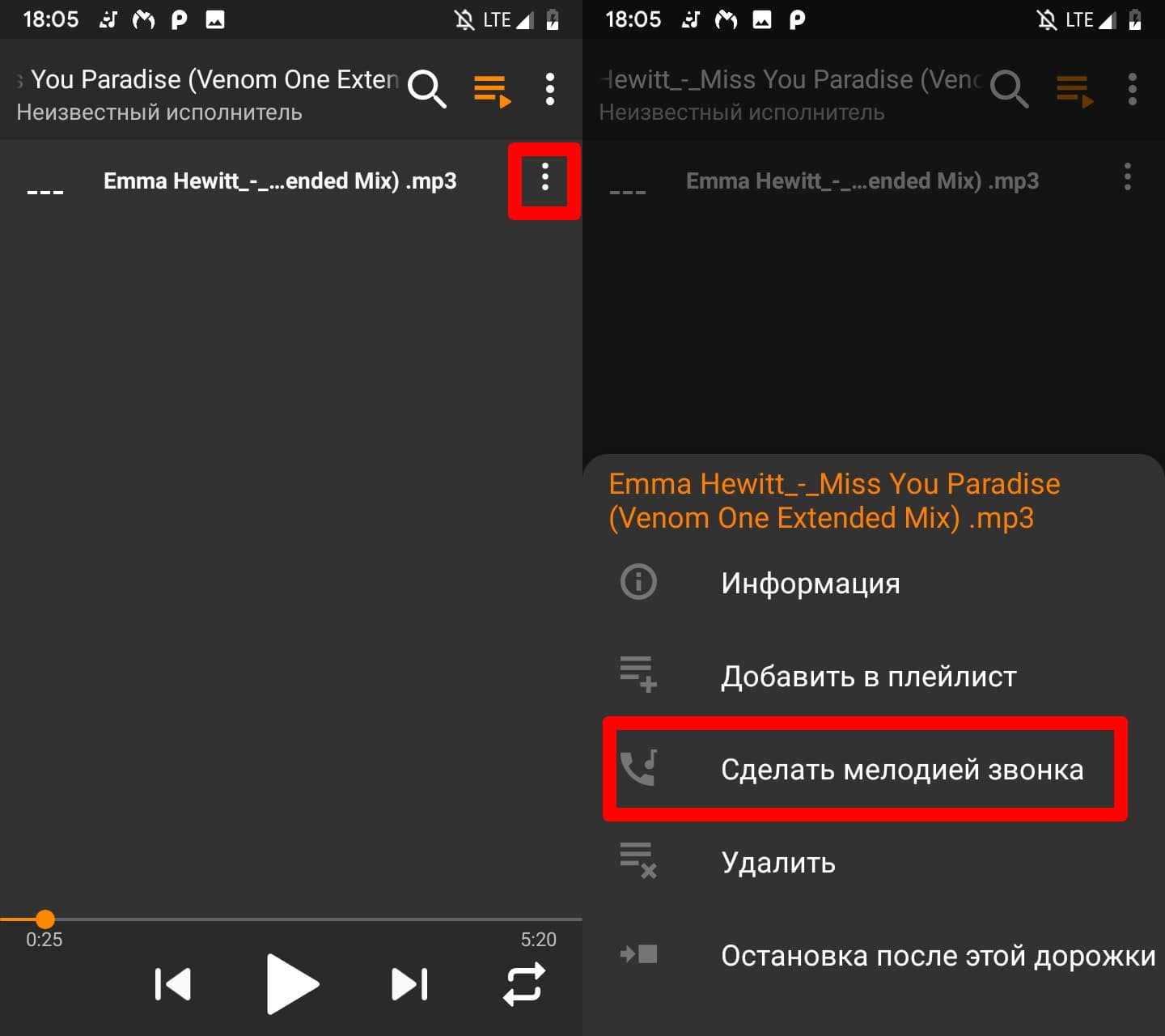 Если возиться с подключением смартфона к компьютеру не хочется, можно сделать проще. Открыть нужную вам мелодию в аудиоплеере, а затем выбрать пункт «Установить на звонок» во всплывающем меню.