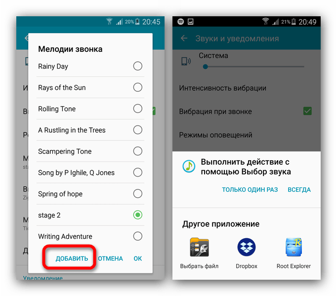 В пиратских прошивках и версиях OS ниже 4.4.х часто всплывает ошибка, при выборе хранилища мультимедиа. Решение — использовать файловый менеджер. Стандартные рингтоны находятся в папке «ringtones» по следующей директории: «/system/media/». Файлы по этому пути системные, поэтому скрыты по умолчанию. Для просмотра рекомендуется использовать кастомный проводник, требующий рут-права. Для установки мелодии понадобится зайти в папку, удерживать палец на выбранном рингтоне и нажать соответствующую опцию.