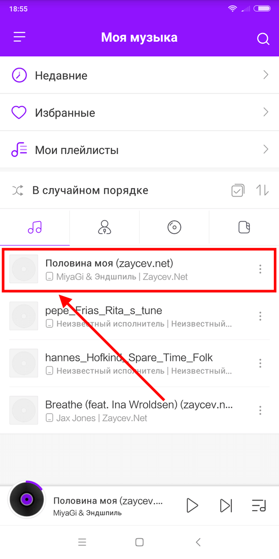 - Все музыкальные файлы будут отображены в списке. Необходимо найти нужный музыкальный файл;