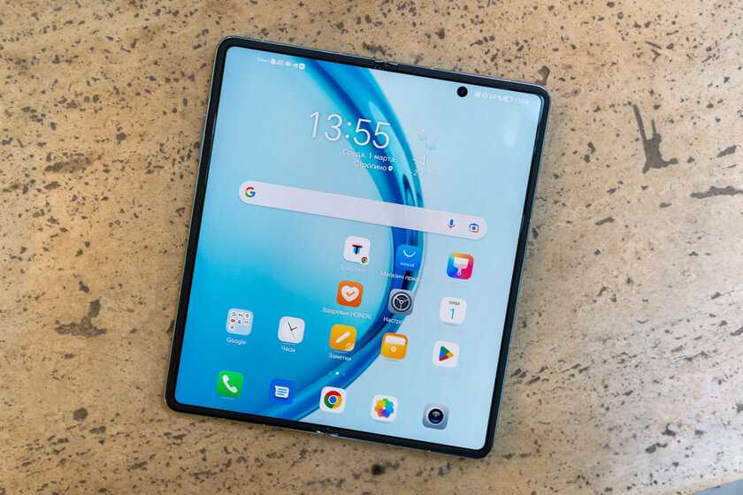 Внешний экран представляет собой 6,45-дюймовый OLED-дисплей 1080p с частотой обновления 120 Гц и соотношением сторон 21:9, а внутренний экран близок к квадрату – 7,9 дюйма с частотой обновления 90 Гц и разрешением 2272×1984. Складка в центре внутреннего экрана все еще заметна, если провести по ней пальцем и посмотреть на устройство под определенным углом, но она лучше, чем у некоторых конкурентов. Оставить внутренний экран с частотой обновления только 90 Гц – тоже странное решение, но оно имеет смысл, если учесть, что Honor позиционирует Magic Vs как устройство, которое можно легко использовать как обычный смартфон