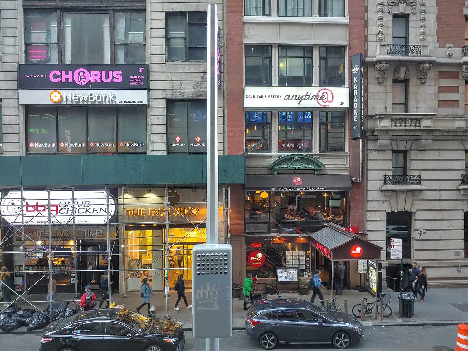 The Pixel 3’s Night Sight feature illuminates the darkest areas, but it makes colors look unnatural. The G8’s photo is the most detailed, and it does a great job of keeping the exposure of the grocery store on the bottom right in check.