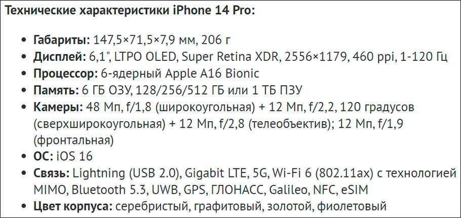 Большинство ценителей продукции Apple изначально были готовы к тому, что разница между iPhone 13 Pro и iPhone 14 Pro будет минимальной, поэтому ничего особенного от новинки не ждали. Но, забегая наперед, скажем, что значимые отличия между этими моделями все же присутствуют. Более того, некоторые инновации, внедренные в iPhone 14 Pro, действительно заслуживают повышенного внимания. Но об этом мы поговорим в соответствующих разделах. А сейчас представим основные характеристики iPhone 14 Pro, чтобы читатели ознакомились с параметрами устройства и сформировали базовое представление о возможностях рассматриваемого девайса.