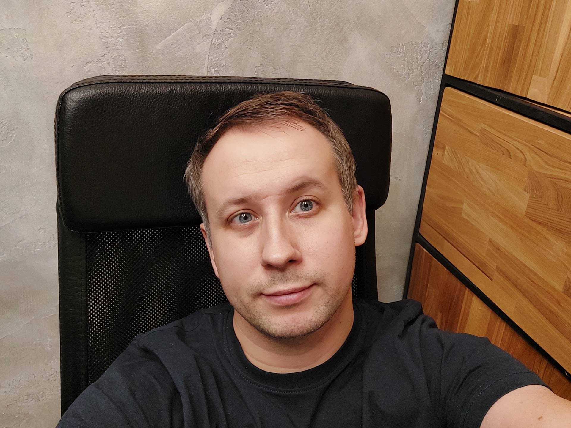 Фронтальная камера хорошая: тут и опциональный широкоугольный режим для групповых снимков, и портрет для «замыливания» фона, и ночной режим для съёмок при плохом освещении. Пример съёмки в ярком рассеянном офисном свете: