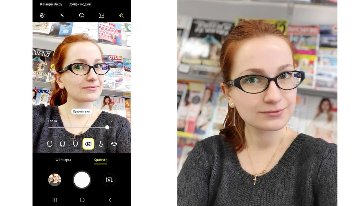 В режиме селфи опять-таки можно регулировать степень блюра. Есть несколько настроек по цветам и оттенкам, а также возможность выполнять несложные «пластические операции». Например, подкорректировать форму носа или подбородка, если вы считаете их неидеальными.