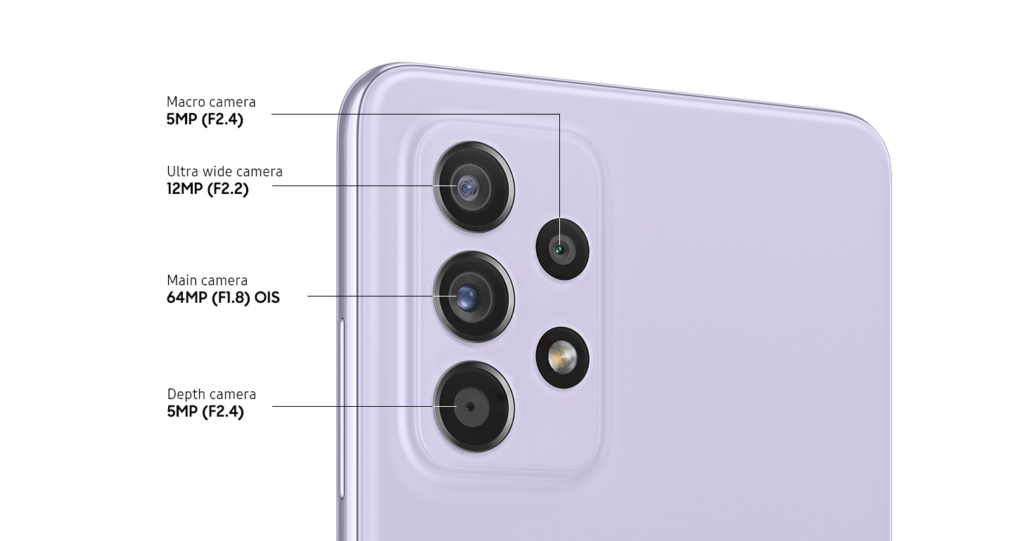 Galaxy A52s 5G выводит ваши фотографии на новый уровень. 64-мегапиксельная основная камера с оптической стабилизацией изображения позволяет делать фотографии в высоком разрешении, чтобы каждый момент получать более четкие снимки. Расширьте углы обзора с помощью сверхширокоугольной камеры. Настройте фокус по своему усмотрению с помощью камеры глубины и снимайте детали, а макро-камера четко отразит каждый мелкий предмет.