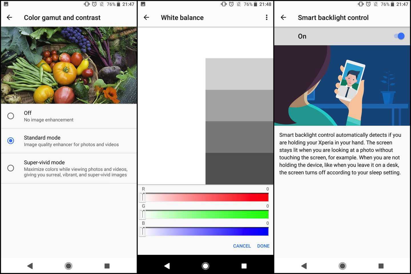 Есть и стандартный пакет настроек отображения, перекочевавший из телевизоров Bravia, с тремя режимами цветовой гаммы и контраста: стандартным стоит режим с улучшенным отображением фото и видео, а помимо него предлагаются менее вырвиглазный и более вырвиглазный. Есть возможность подкорректировать баланс белого. Цвета у экрана по-хорошему сочные и насыщенные, но вокруг, например, белого текста на черном фоне всегда есть сильно заметный ореол. Издержки ЖК-подсветки.