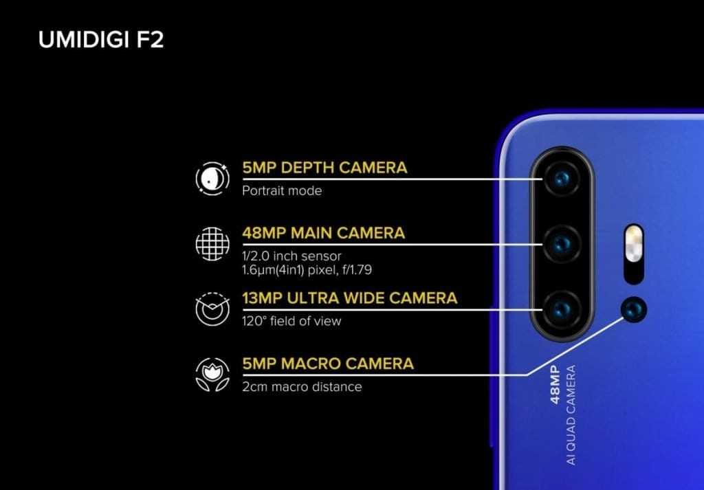 UMIDIGI F2 имеет основную камеру, которая состоит из четырех датчиков: основной датчик на 48 МП с диафрагмой f/1.79, второй датчик глубины на 5 МП, широкоугольный датчик с разрешением 13 МП и 5 МП датчик для макросъемки.