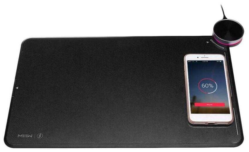 Данная модель способна не просто заряжать смартфон или планшет, но и может использоваться в качестве коврика для обыкновенной компьютерной мышки. Устройство представляет собой пластиковую площадку для мыши, размер которой составляет 42х26 см, предусмотрена шайба управления и больше ничего. Зарядка подключается к персональному компьютеру или ноутбуку, колесико управления регулирует громкость аудио и облегчает использование светодиодной подсветки. Основание у этого коврика металлическое, однако для того, чтобы не испортить поверхность стола, покрыто слоем полиуретана, который, к слову говоря, практически не скользит.